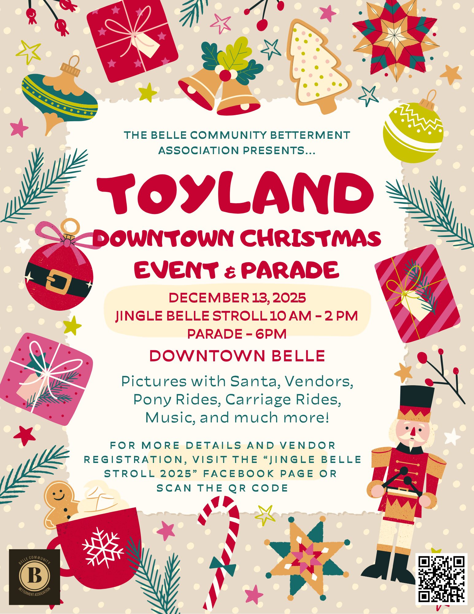 Get ready to be enchanted by the shimmering spectacle of our Christmas Parade on December 13 at 6:00 pm! This year’s theme, “Toyland,” promises to dazzle as it winds through the heart of Belle, spreading holiday joy and cheer to all. Gather your family and friends to experience the magic of this beloved tradition.